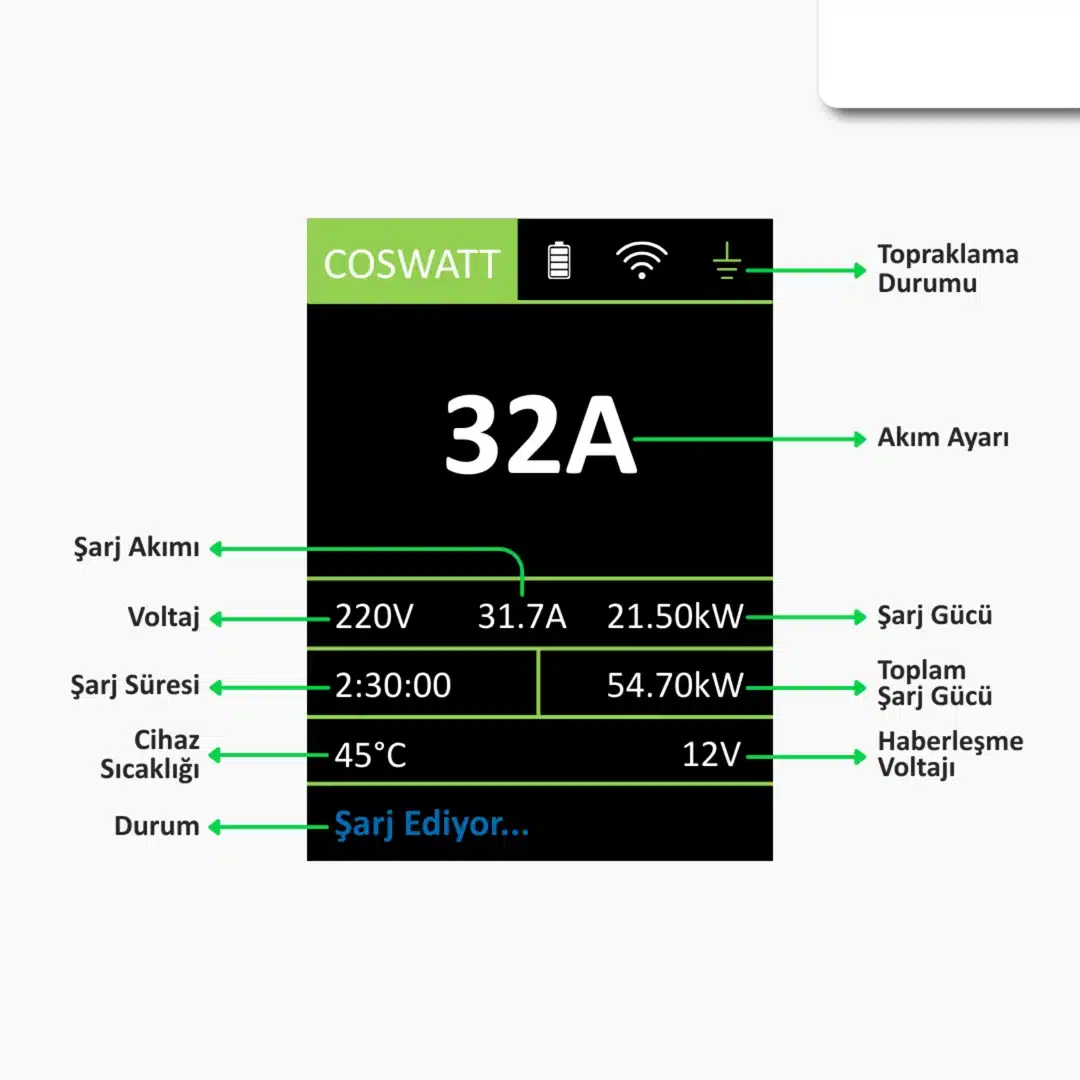 2.8’’ ekran üzerinde anlık akım ve güç değerleri, şarj süresi ve şarj durum bilgileri yer almaktadır.